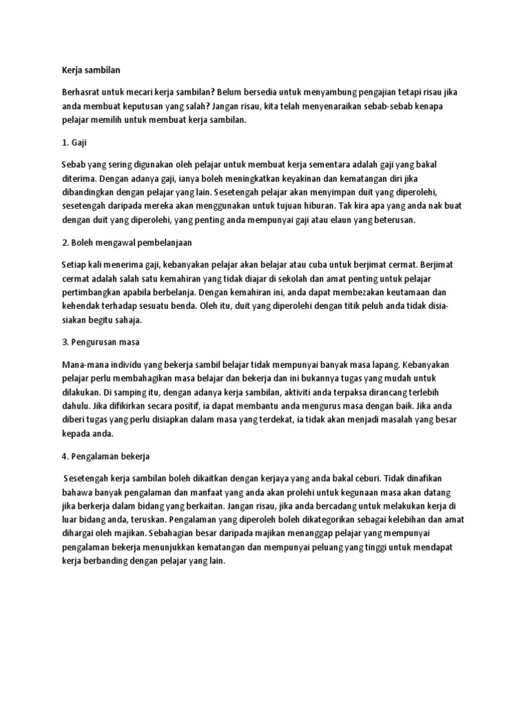 Admin Recruitment ExecutivesAssistants Full-timePart-ti. Contoh kerja part time berikunya adalah menjadi pegawai toko yang bisa dijadikan sebagai kerja sampingan oleh pelajar. Jadi saya ingin cadangkan anda beberapa modal bisnes yang mudah murah dan tidak mengganggu waktu belajar di universiti.